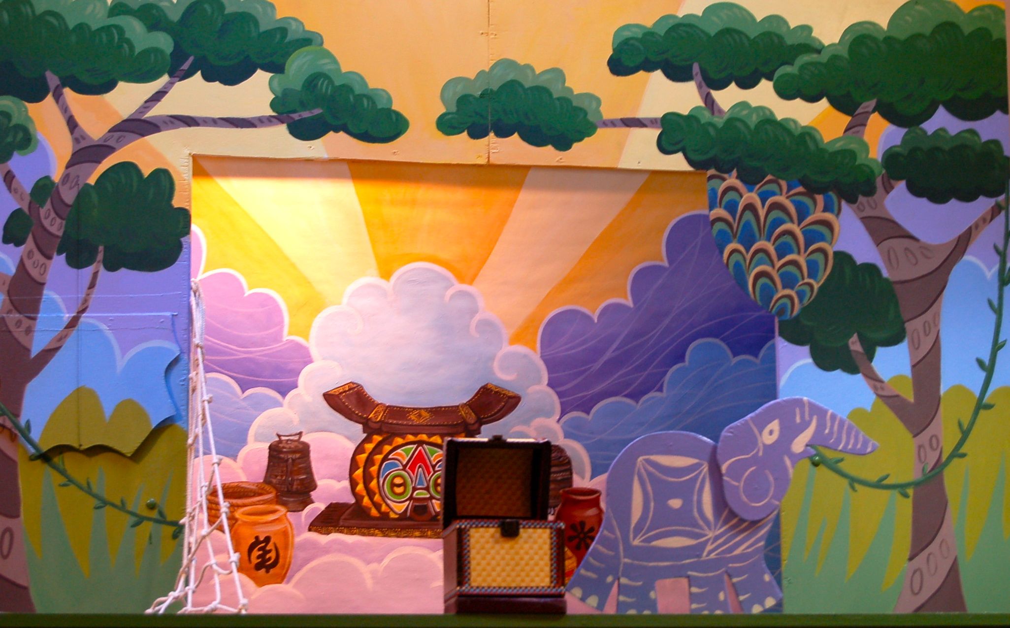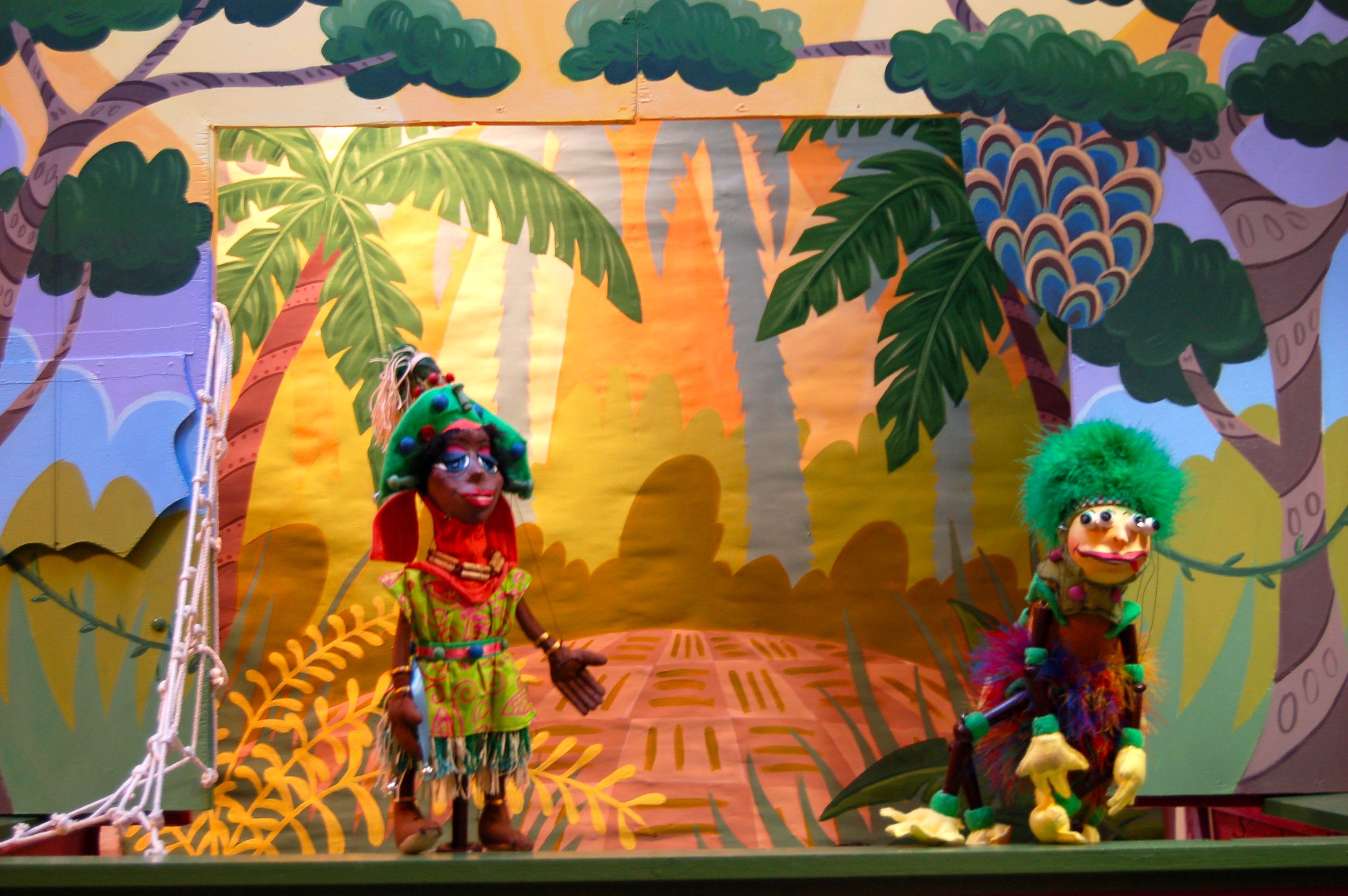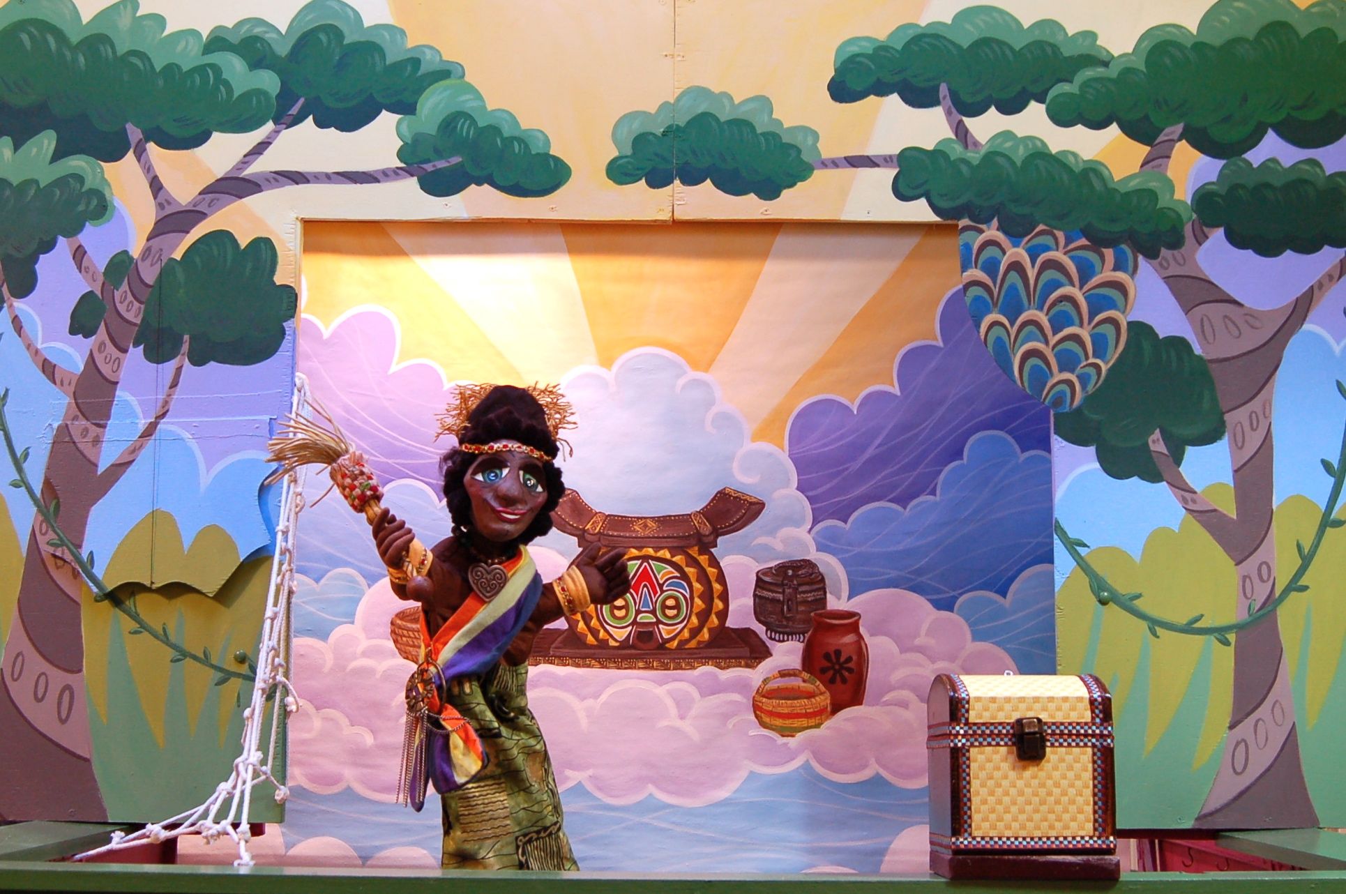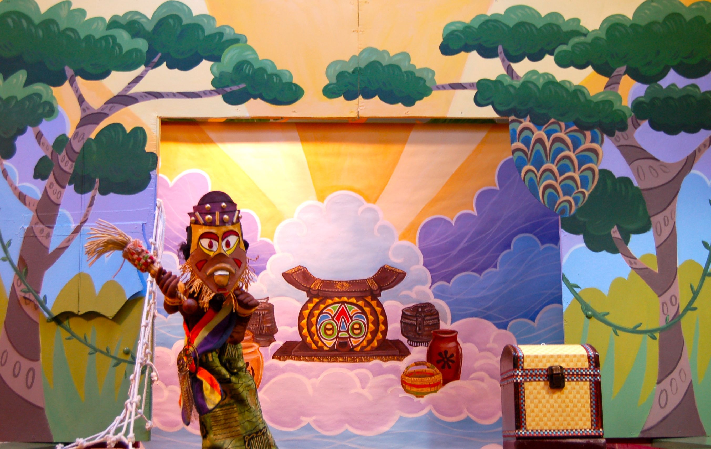 In the jungles of Africa, lives a tiny spider known as Anansi. Although small in size, he is known for his large ideas. One day he decided that the children of Earth needed stories to tell each other. But...all the stories were kept by Nyami, the Sky God. Ahhhh, but this is the first story. The story of how little Anansi captured Osebo, the Leopard Of the Terrible Teeth; Mmboro, the Hornets Who Sting Like Fire; and Mmoatia, the Fairy Man Never Sees. And in so doing, he receives from Nyami the golden box of stories to give to the people of Earth. Presented with authentic African music, colorful costuming and classical African design.