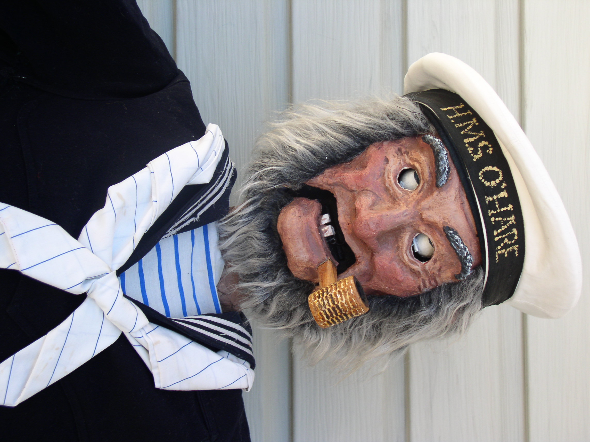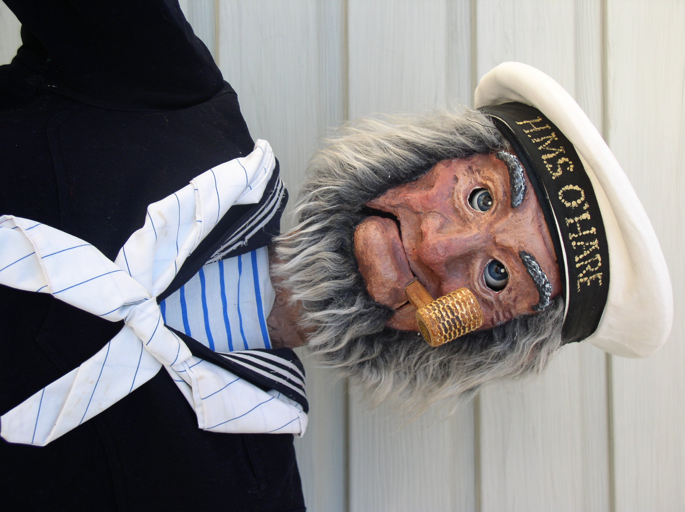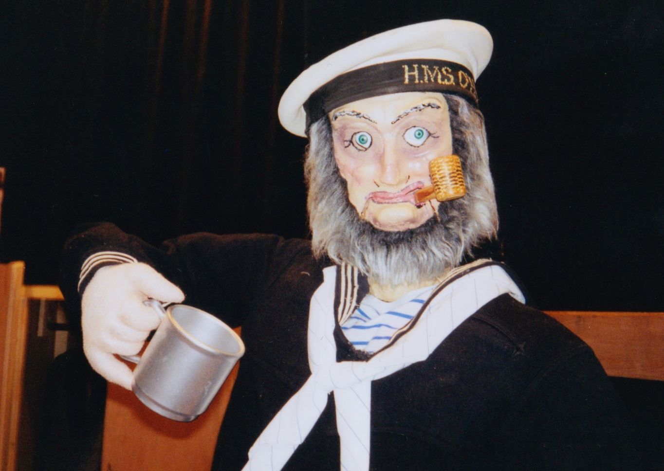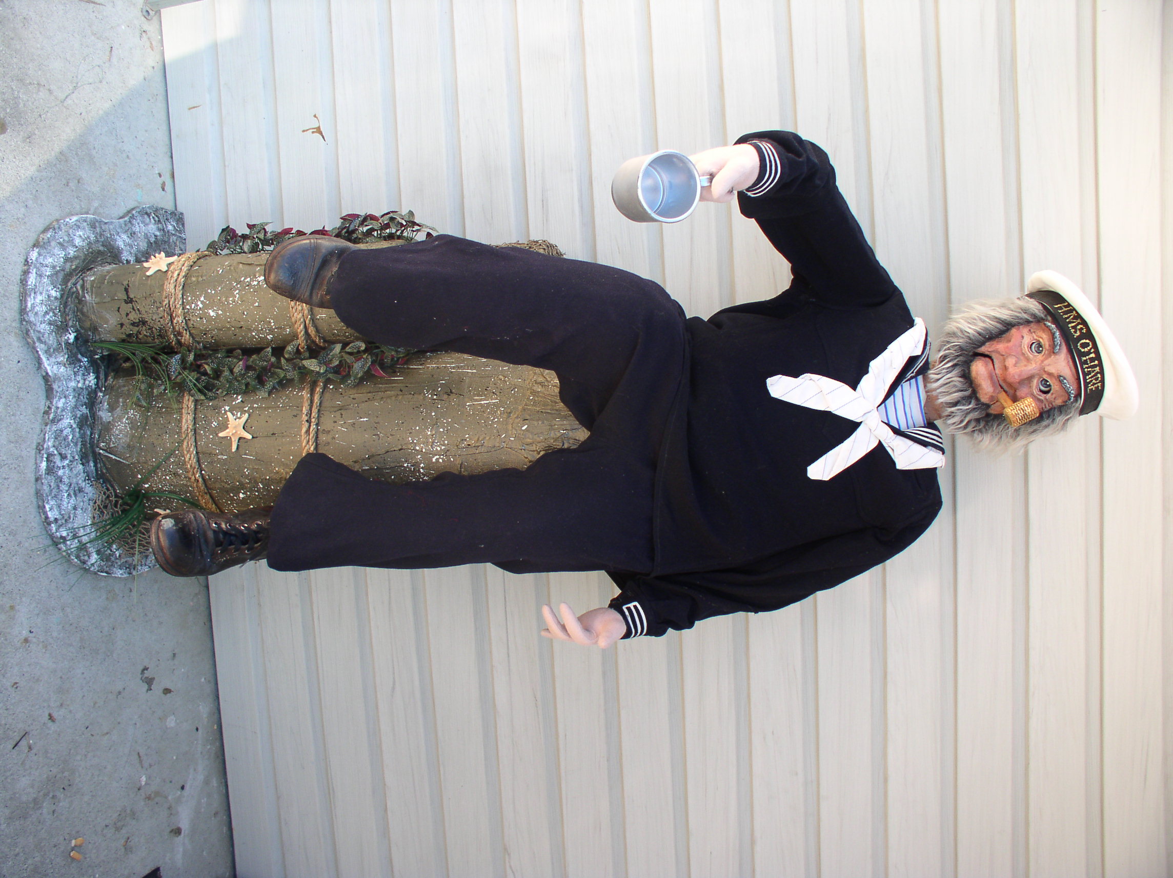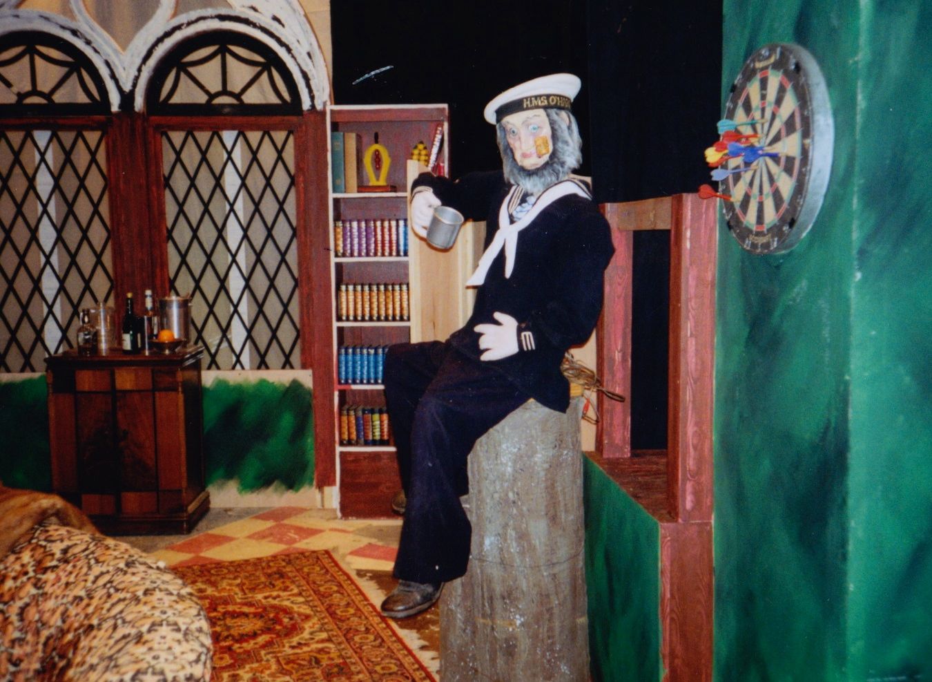 The ultimate cat and mouse game is played out by two men who try to outsmart each other. Each a genius at role and game playing, they set upon destroying each other's lives. The play takes place in the home of one of them. He is a collector of unusual items and artifacts. One piece that stands in his game room is the figure of "Captain Jolly Jack Tar, The Jovial Sailor". A fun house mechanical figure that laughs and raises a mug of beer as he rocks back and forth. This is a very important prop, since the final clue to the mystery is tied up with it. Our Captain Jack comes seated on a wood pier setting and must be worked from behind a wall. The figures laughs, lifts his mug, and his eyes raise into his head when his mouth opens. A truly eerie and frightening figure from a demented fun house.