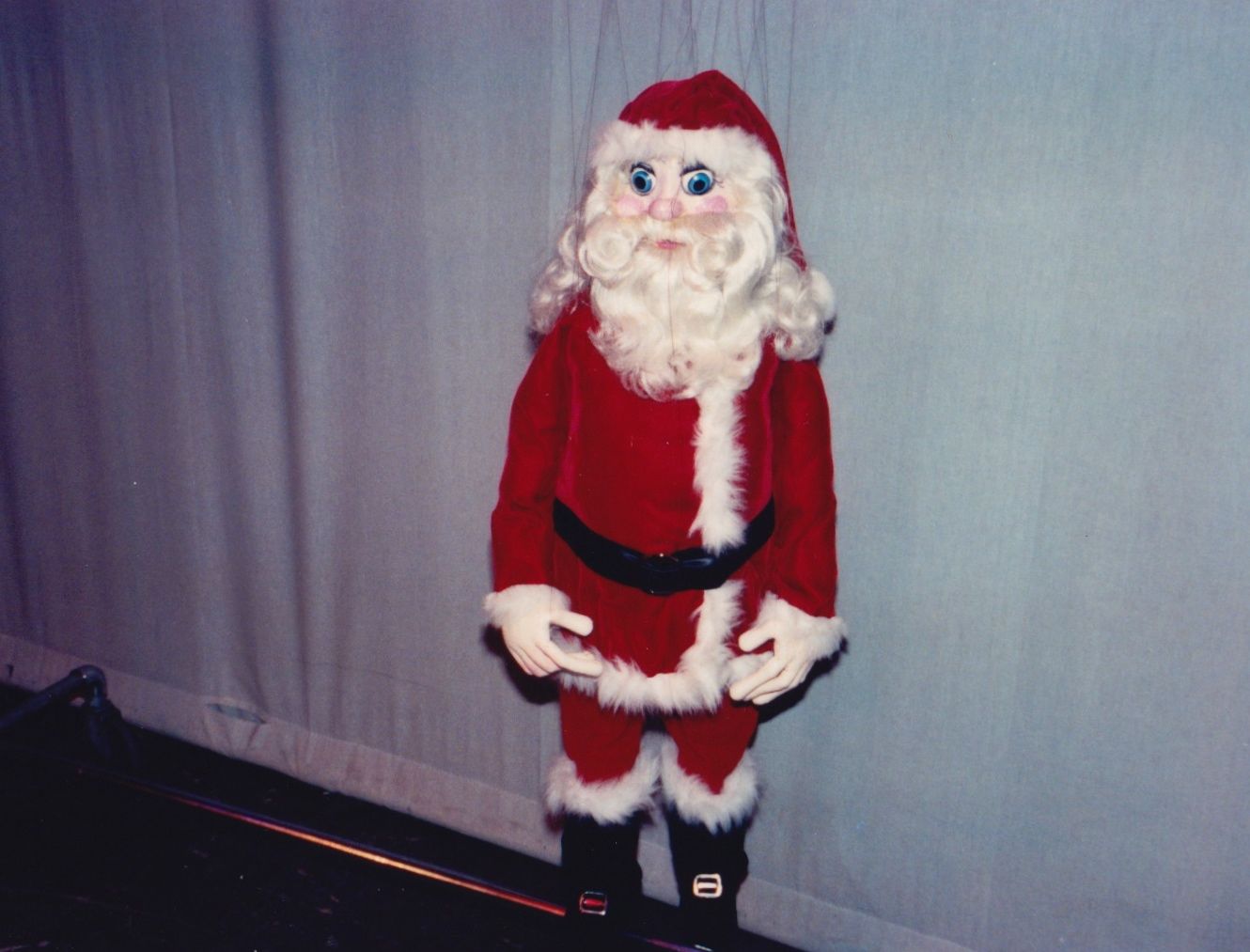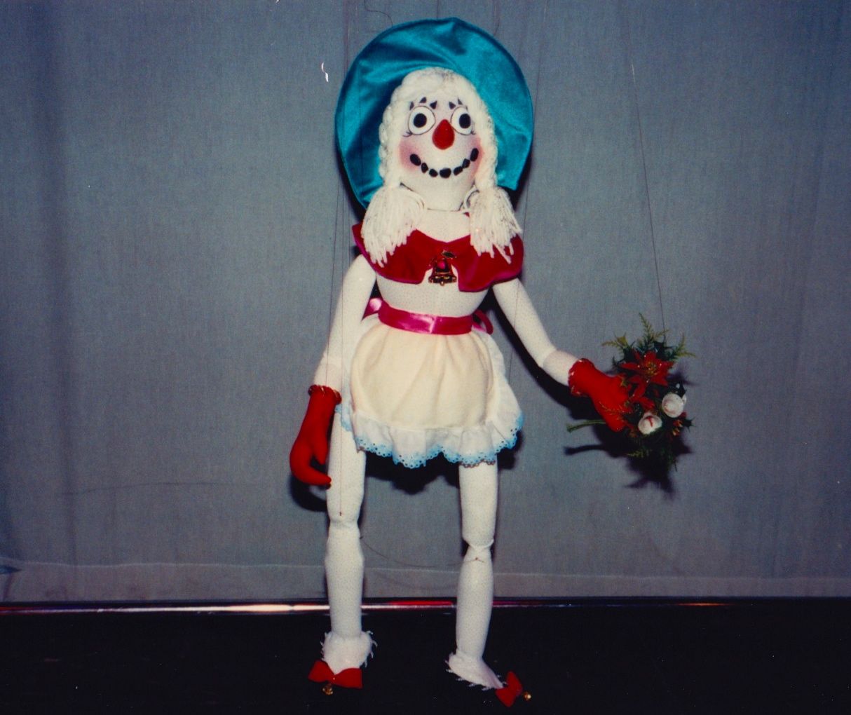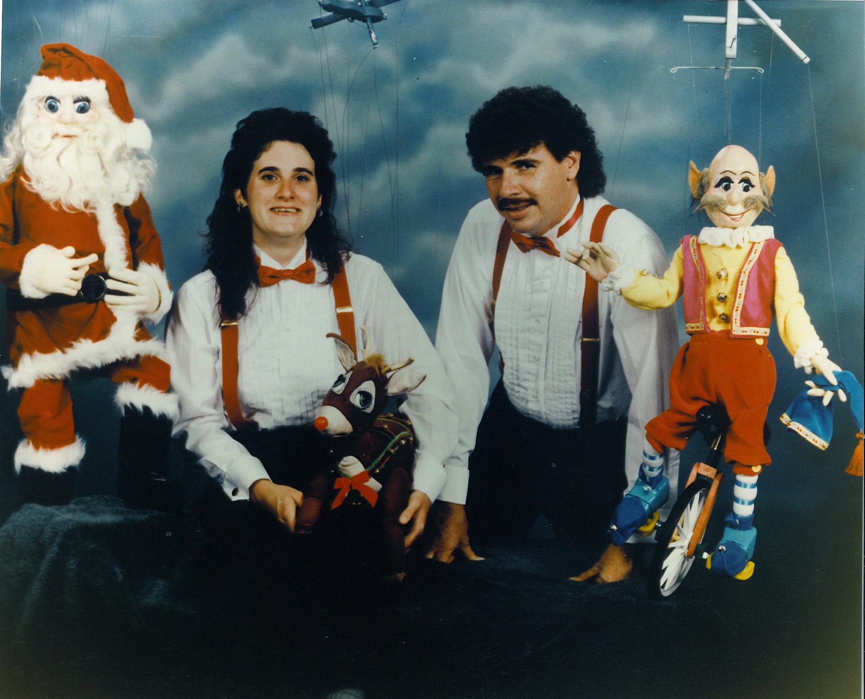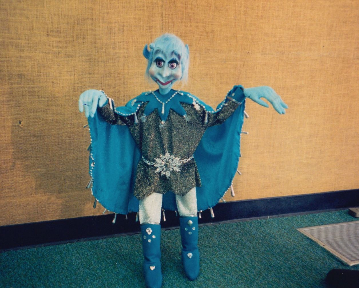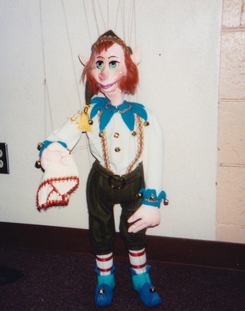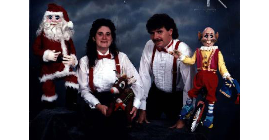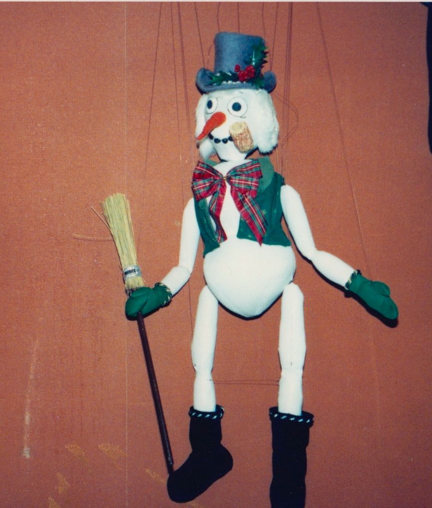 Our most requested extravaganza takes you on a seasonal tour of Santa's Workshop and his surrounding village. You'll meet Jack Frost, Mrs. Claus, and also take a peek at Santa's elves at play! You'll witness waltzing X-mas tress, ice skate with penguins, prance through the sky with Rudolph, and even stop to admire a Chanukah celebration. Each of these colorful and intricate marionettes stand three feet tall and are fully animated. The puppets walk up to the children and entertain them while singing and dancing to popular holiday tunes. This performance is presented in the style of "cabaret puppetry", where you can see the puppeteer and the puppet work side by side, which is not often seen in the Bay Area. This show is suitable and fun for all ages! Photos from 1986.
