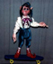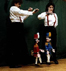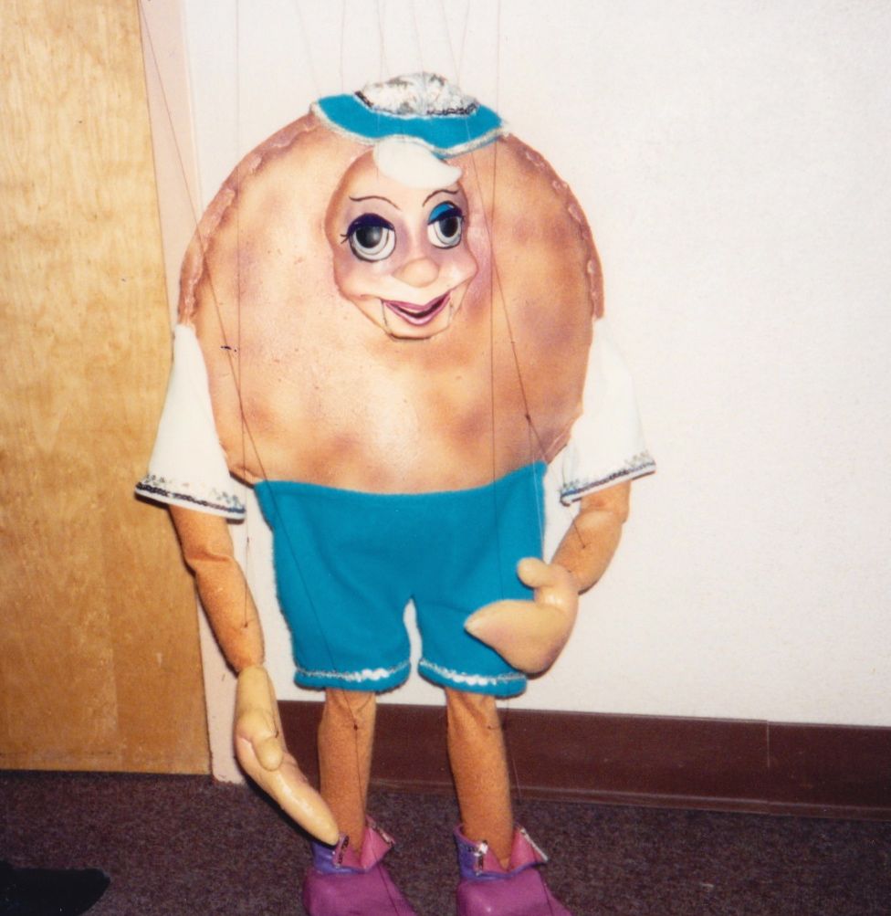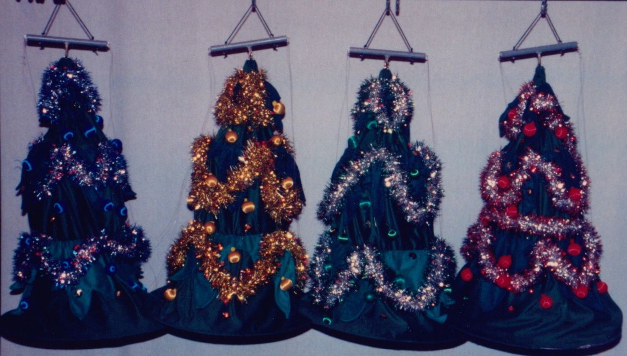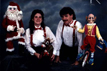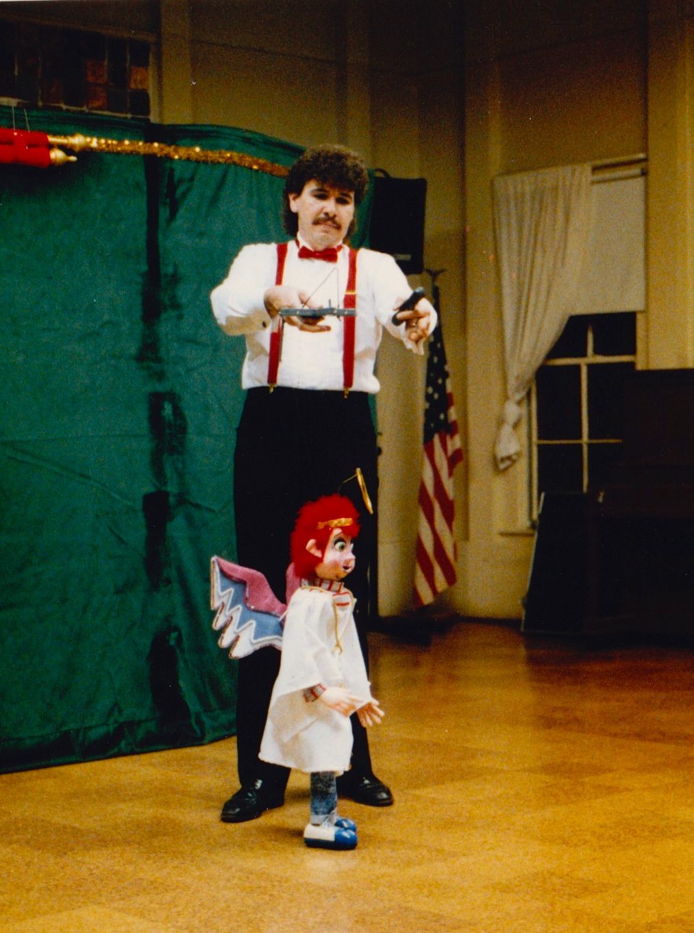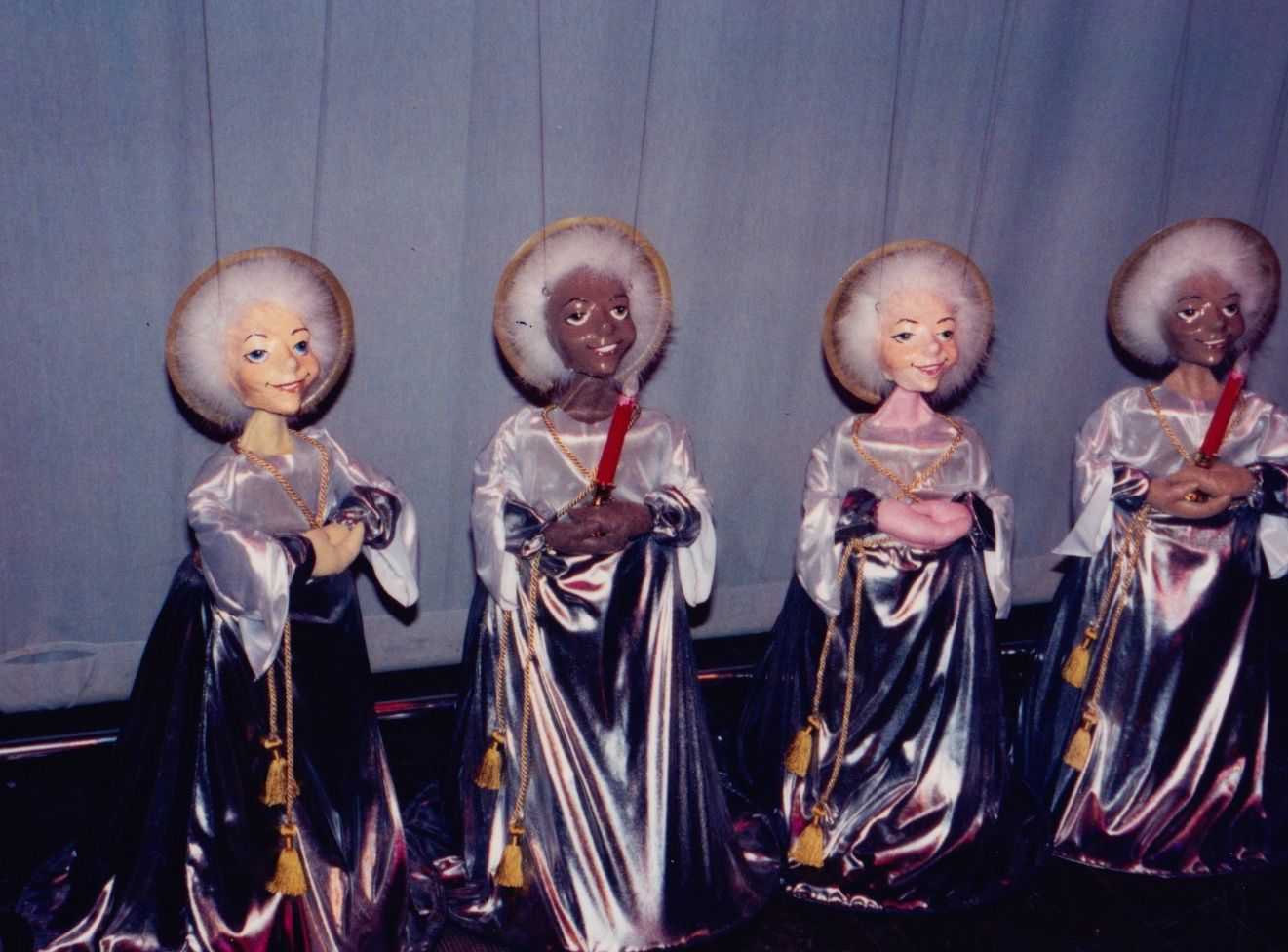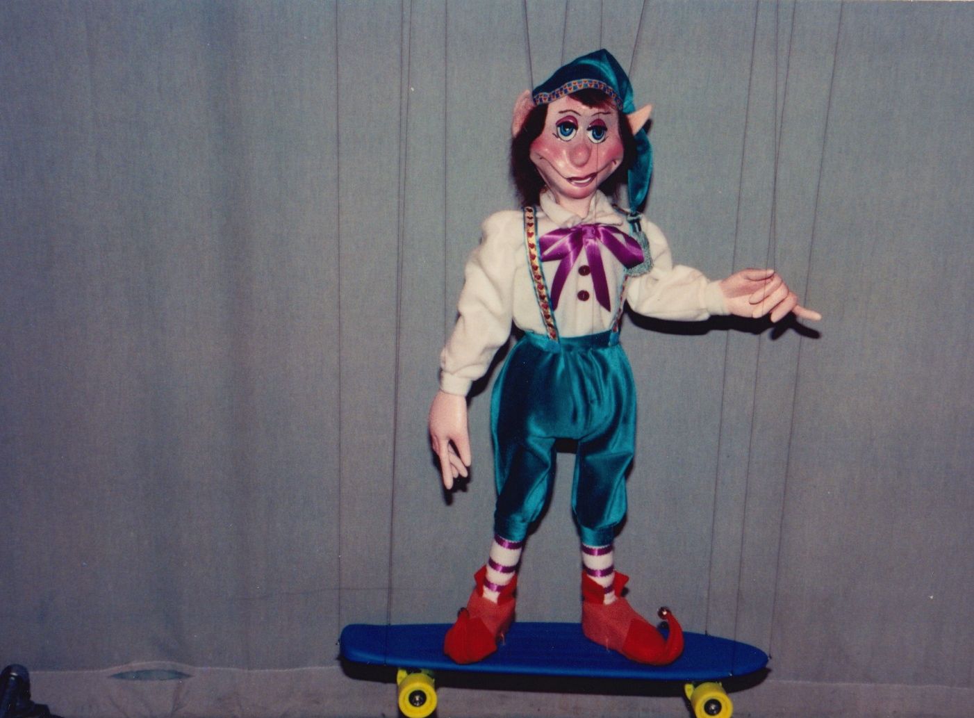 Our most requested extravaganza takes you on a seasonal tour of Santa's Workshop and his surrounding village. You'll meet Jack Frost, Mrs. Claus, and also take a peek at Santa's elves at play! You'll witness waltzing X-mas tress, ice skate with penguins, prance through the sky with Rudolph, and even stop to admire a Chanukah celebration. Each of these colorful and intricate marionettes stand three feet tall and are fully animated. The puppets walk up to the children and entertain them while singing and dancing to popular holiday tunes. This performance is presented in the style of "cabaret puppetry", where you can see the puppeteer and the puppet work side by side, which is not often seen in the Bay Area. This show is suitable and fun for all ages! Photos from 1986.