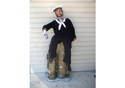 The ultimate cat and mouse game is played out by two men who try to outsmart each other. Each a genius at role and game playing, they set upon destroying each other's lives. The play takes place in the home of one of them. He is a collector of unusual items and artifacts. One piece that stands in his game room is the figure of "Captain Jolly Jack Tar, The Jovial Sailor". A fun house mechanical figure that laughs and raises a mug of beer as he rocks back and forth. This is a very important prop, since the final clue to the mystery is tied up with it. Our Captain Jack comes seated on a wood pier setting and must be worked from behind a wall. The figures laughs, lifts his mug, and his eyes raise into his head when his mouth opens. A truly eerie and frightening figure from a demented fun house.